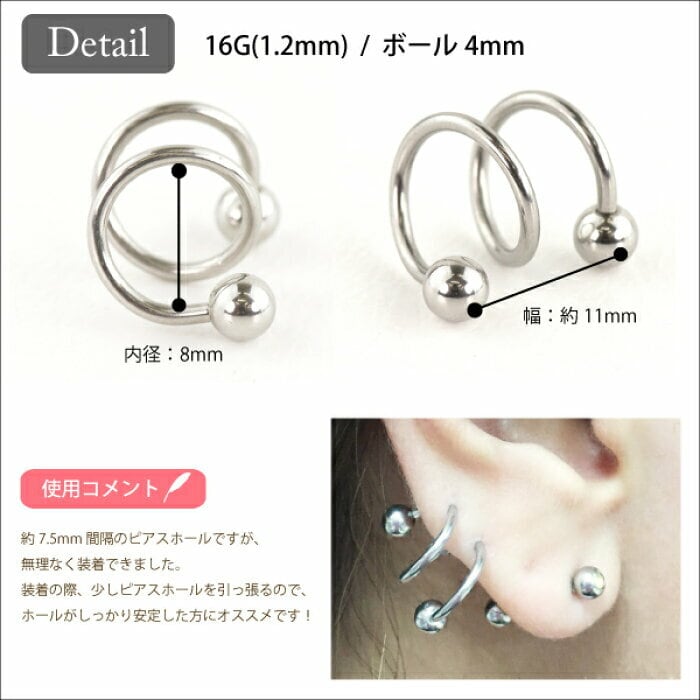 ダブル ツイスト スパイラル 1本 16G 内径8mm ボール 4mm サージカルステンレス 316L ボディピアス