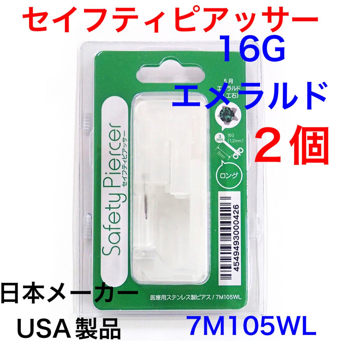 2個 エメラルド 7M105WL セイフティピアッサー 滅菌済ロングタイプ ピアッシング 16G(1.2mm) シャフト8m ファーストピアス サージカルステンレス