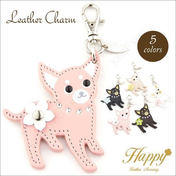 1個 チワワチャーム 牛本革 レザー ラインストーン付き Happy 全5色 キーホルダー チャーム リード 首輪 キーリング 犬 日本製 ハッピー hc-22